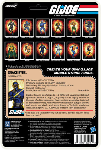 Packaged on a blistered cardback that evokes the classic G.I. Joe toy line of the early ‘80s, this figure is designed to look and feel like the vintage toys fans know and love. Featuring retro O-Ring construction and 12 points of articulation, Snake Eyes offers ultimate posability, whether he’s silently infiltrating Cobra’s stronghold or striking a dramatic pose on your shelf.