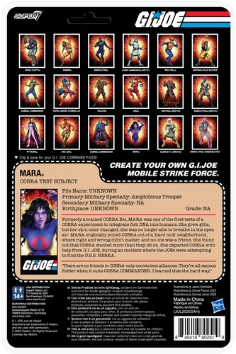 Inspired by the character from G.I. Joe Season 1, Episode 45, “Memories of Mara,” this action figure is 3.75” scale with 12 points of articulation for ultimate pose-ability. Fashioned with vintage O-ring design, the Mara ReAction+ Figure includes a breathing helmet and scuba tank accessory with a clear dome and metallic paint details.