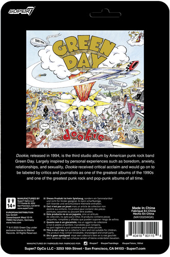 He’s arrived as a ReAction Figure, inspired by Green Day’s Longview music video. This 3.75” scale collectible comes with a cream pie and dog turd accessories. The blister card packaging is influenced by the cover art for Green Day’s critically acclaimed album, Dookie (1994), the third studio album this American punk rock band made.