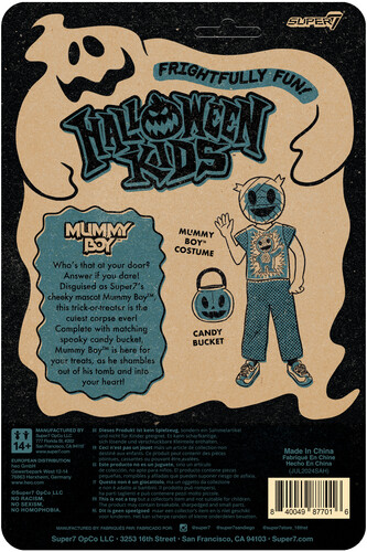 This 3.75” scale, articulated Halloween Kids ReAction Figure features a young trick-or-treater outfitted in a costume inspired by the vintage Halloween costumes from the 70s and 80s, in a colorway reminiscent of a 2008 Japanese Vinyl figure of Super7’s beloved mascot, Mummy Boy.
