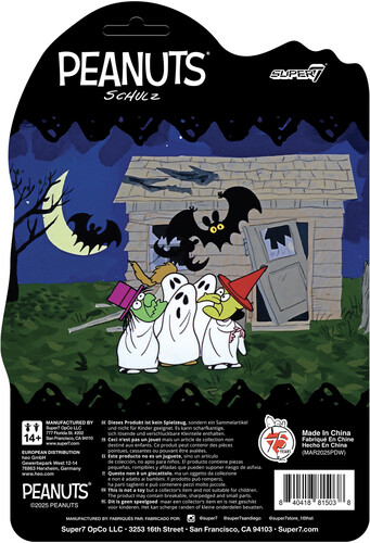 Charlie Brown looks perfectly ready to go tricks-or-treating as a ReAction Figure, dressed in his ghost sheet costume, with numerous eyes cut out. He even comes with paper bag and rock accessories.