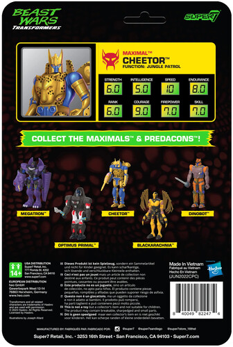 This 4” articulated Transformers: Beast Wars ReAction Figure of Cheetor features the speedy Maximal in robot form and includes blaster accessory.