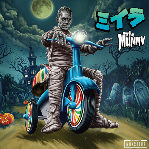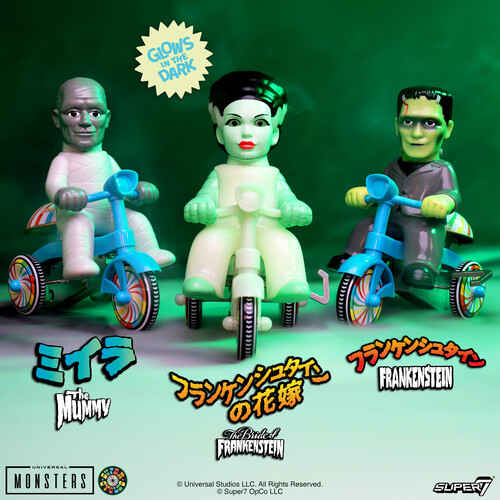 Inspired by Universal Pictures’ classic monster, this vintage-style plastic and tin wind-up tricycle toy features a greyscale, 5” soft vinyl Mummy in the driver’s seat of a spiffy blue trike, with colorful wheels and a functioning bell above the back tire!