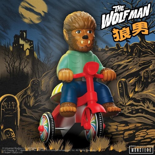 Inspired by the 1941 film, The Wolf Man, this premium vinyl figure sits atop a red tricycle, influenced by vintage Japanese-style plastic and tin wind-up tricycle toys. Colorful wheel patterns match the functioning bell, above the back tire. The internal wind-up mechanism drives the trike and rings the bell, for a howlin’ good time.