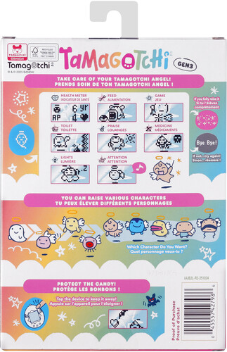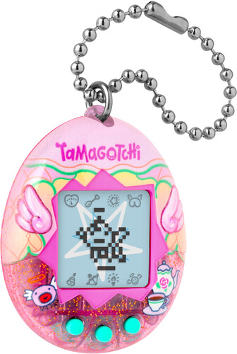 Comes with Angel programming, the device will begin with the Obaketchi Angel (a ghost character) and depending on how you nurture your character will determine which of the 5 adult Tamagotchi Angel characters you will get. You feed your character, clean up after it, and even praise it. Plus, you can play the Shooting Star mini game! Includes the CR2032 battery and attaches to your bag so it goes everywhere! Ages 8+