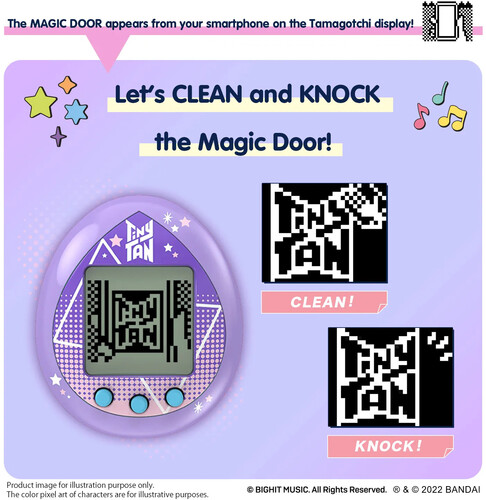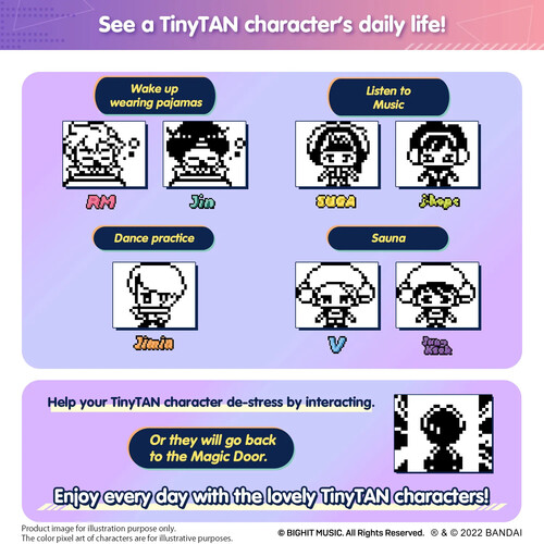 The way you interact with the “Magic Door” will enable one of the seven TinyTAN characters to come through the “Magic Door” into your Tamagotchi device! Let’s become close friends with the TinyTAN characters and spend time together every day.
