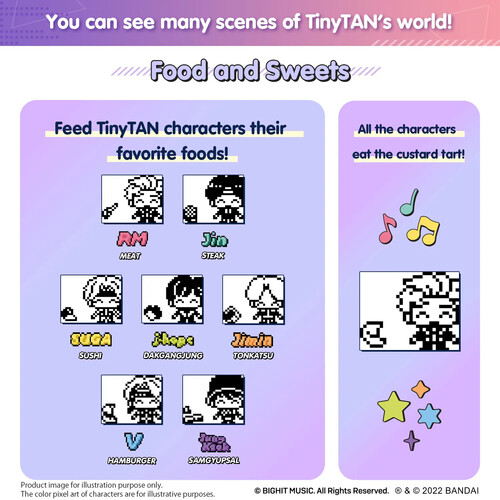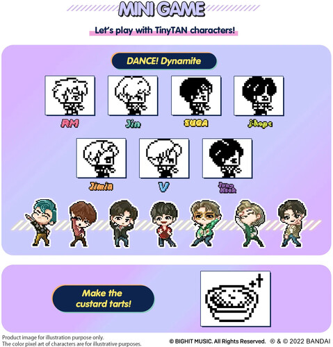 - The food which you give to TinyTAN characters are each character’s favorite food! Two mini-games are included to play with the TinyTAN characters: Dance to “Dynamite” and make custard tarts.