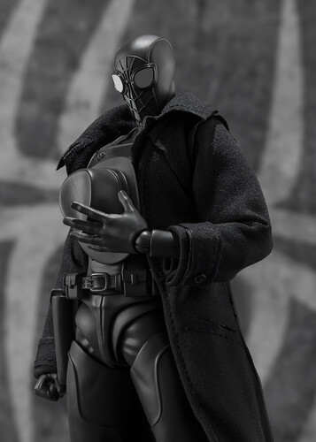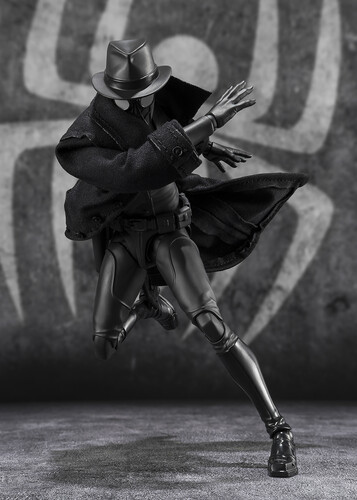 SPIDER-MAN NOIR's coat is made from cloth goods, allowing for the recreation of various dynamic action poses. In order to recreate various comical action sequences, SPIDER-HAM comes with various exchangeable parts. You can even equip him with his hammer!