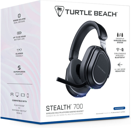 Rank up to Premier Cross-Platform Performance. The Turtle Beach Stealth 700 wireless multiplatform gaming headset for PlayStation, PC, Steam Deck and mobile is redesigned for a 3rd generation of premium gaming prowess. The all-new CrossPlay wireless system with dual USB transmitters and simultaneous Bluetooth connectivity delivers quick and easy connection to gaming consoles, PC & mobile devices. Huge, 60mm Eclipse Dual Drivers deliver unparalleled audio quality, and the Gen 3, flip-to-mute mic with A.I. noise cancellation allows for exceptionally clear voice accuracy. Plus, using the Swarm II companion app, you can adjust your microphone & audio settings to your exact, customized preference. Dominate for hours in complete comfort with a best-in-class 80-hour battery life, and memory foam ear cushions.