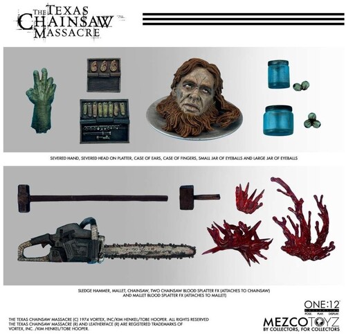 From The Texas Chainsaw Massacre (2003), the One:12 Collective Leatherface captures the bone-chilling horror of the Hewitt family’s most infamous butcher. He stands ready with his chainsaw and an array of grisly “evidence”, including a rotting severed hand, collected fingers in a box, human ears, two jars of eyeballs, and a decapitated head on a silver platter.
