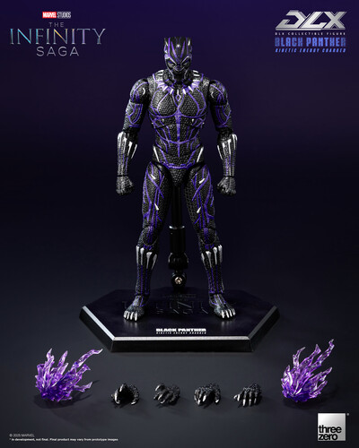 The DLX Black Panther (Kinetic Energy Charged) stands approximately 6.8 inches (~17.2 cm) tall and is crafted using threezero’s renowned DLX die-cast system, featuring approximately 44 points of articulation. The figure's detailed structural engineering and exquisite design allow it to showcase a wide range of action poses while maintaining a realistic appearance. The meticulous attention to detail across the entire body recreates the appearance of the King of Wakanda.