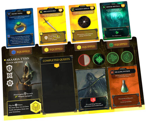 Components: 1 Game Board, 4 Player Mats, 9 Character Tokens, 15 Magic Tokens, 15 Trait Tokens, 2 Lock Tokens, 55 Item Cards, 3 Staff Item Cards, 10 Puzzle Item Cards, 10 Djinn Riddle Cards, 1 Djinn Token, 48 Quest Cards, 7 Energy Cards, 20 Death Cards, 1 Torch Marker, 6 Custom Dice