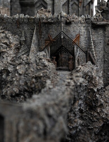 - Merges Gondorian stonework with twisted Orc fortifications for layered visual narrative