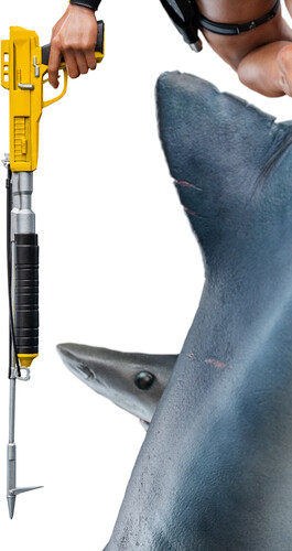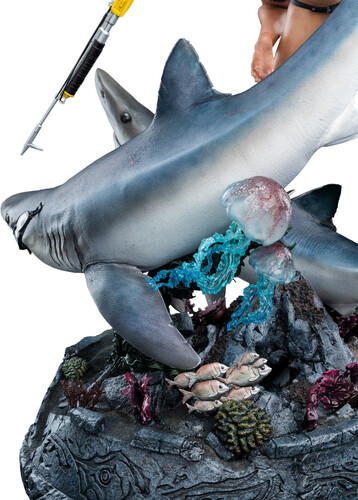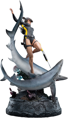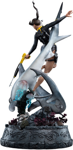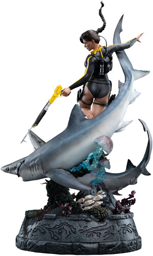 - A dynamic pose, featuring two Sharks, two jellyfish, a school of fish, and Lara Croft mid-dive