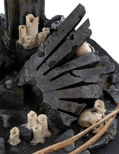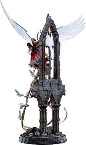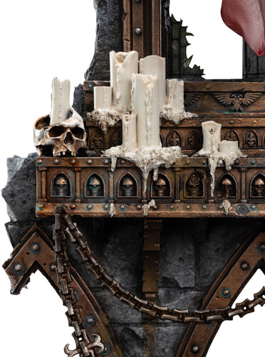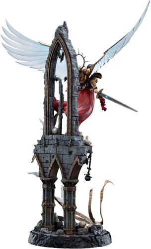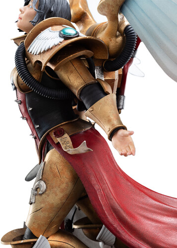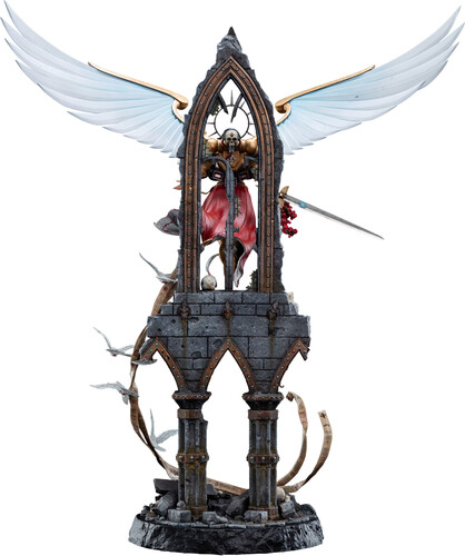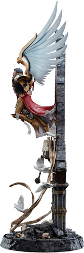 Celestine the Living Saint is captured in breathtaking, reverent detail—a tribute to the legendary figure who inspires armies across the galaxy. Every element of the statue has been meticulously designed to embody Saint Celestine’s awe-inspiring power and grace. Her luminous golden armour is rendered with exquisite precision, echoing its blessed purpose and evoking a divine splendour that starkly contrasts with the ruined, decrepit remains of war below. Appearing to float weightlessly among the shattered ma