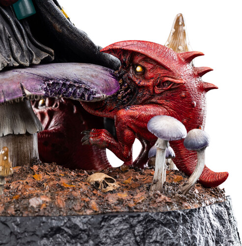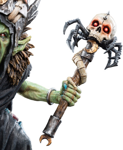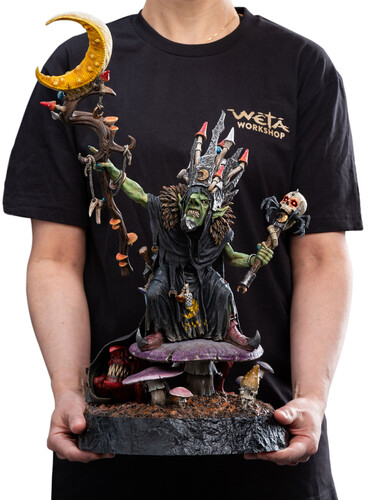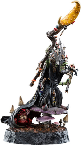 Every inch of this masterpiece captures the essence of his dark power—his staff, adorned with twisted mushrooms and ritualistic fetishes, stretches high into the air, while his regal yet malevolent presence demands attention. The intricate textures, from the sculpted fungi to the jagged crown, showcase the exceptional artistry of our artisans, particularly that of Daniel Cockersell, who traditionally hand-sculpted this stunning piece physically out of clay.