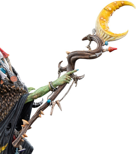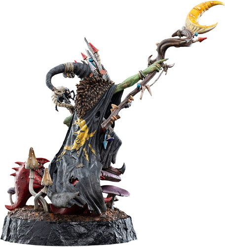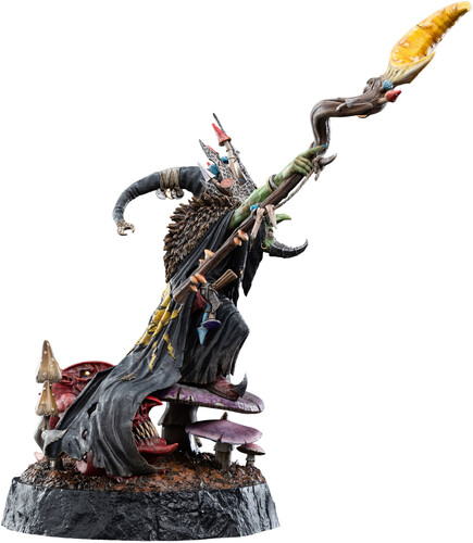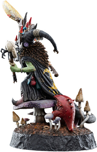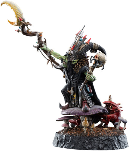 The dynamic pose and lifelike features reveal the deep attention to the character’s essence—his malice, cunning, and unyielding ambition are palpable. Whilst hidden within the fungal base, a pair of hungry and mischievous squigs gnaw and gnash without restraint.