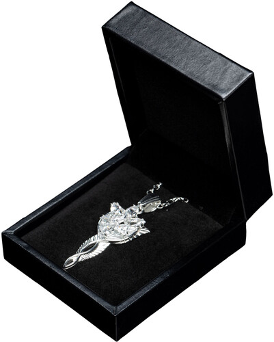 Made from Sterling Silver and Cubic Zirconia, this piece is a beautiful prop replica and gorgeous piece of jewellery in one. The Evenstar pendant comes in a beautiful black gift box, the inside bottom of the box is lined with velvet and has a pin for the pendant to hang off.