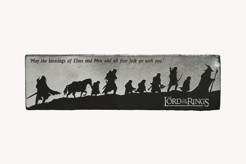 The classic silhouette of the nine members of The Fellowship of the Ring as they set out from Rivendell on their quest to guide Frodo to Mordor and the destructive forces of Mount Doom, ridding Middle-earth forever of the dark brooding menace of the Dark Lord Sauron.