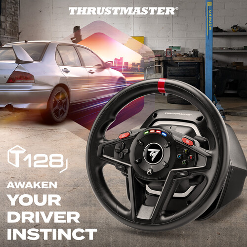 T128 features the HYBRID DRIVE system, which combines a belt and gears mechanism to provide immersive and versatile Force Feedback, and delivers 20% more power (in relation to previous Thrustmaster TMX hybrid racing wheels). Its lightweight wheel rim helps you really feel the sensations transmitted by the Force Feedback system, for an authentic racing experience and to optimize your racing lines. A 4-color LED strip lets you keep an eye on the engine speed, and indicates when it is time to shift gears. Thanks to the clamp-based attachment system, the racing wheel can be adjusted to fit desks and tables for quick and easy setup. The T2PM pedal set included with the racing wheel features patented frictionless magnetic technology, for enhanced precision that won’t decrease over time. T128 has been designed for all gamers looking for a first racing wheel offering new immersive sensations, and users who want to improve their driving skills. T128 is an officially-licensed racing wheel for Xbox Series X|S and Xbox One, and is compatible with PC.