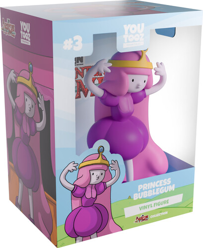 Youtooz has got a brand new princess, that’s right Princess Bubblegum has arrived to take over with her vinyl debut! Standing at 4.8 inches tall and throwing hands up to either side of her pale face that has pursed lips, a golden tiara with a blue jewel on its tall front circles her head as thick pink hair falls to the ground behind her.