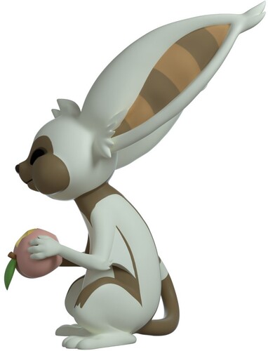 Momo sits crouched at 3.4 inches, snacking on a moon peach that he holds in his paws. His long white ears extend high above his head, moulded with tuffs on the base and tips. His ringed tail curls out around his brown and white body.
