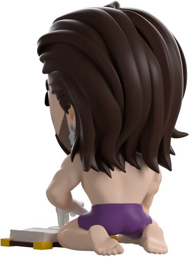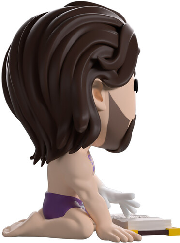 Kneeling in front of an open purple and yellow tome at 3.8 inches tall, his ghostly white hand flicks over the pages as a loving smile peeks through his thick brown beard, and long hair falls past his shoulders. With a purple marking on his left cheek under kind eyes that matches the one on his muscular chest, he wears nothing but tight purple shorts as a silver earring hangs from his left ear.