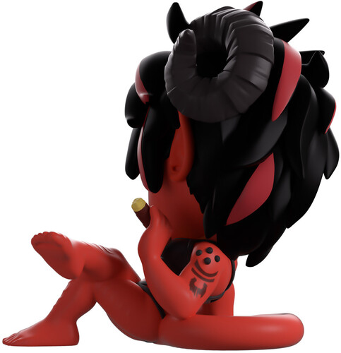 Propped up on her elbow to lay at 3.7 inches tall with her left leg casually resting on the right knee, she holds a lit cigar in her hand as a playful smile crosses her red face under freckled cheeks and roguish eyes. With black and red hair sweeping over her face between a pair of horns and over pointed ears, she wears a black top that has straps wrapping around her torso, as a long pointed tail curls around her back.