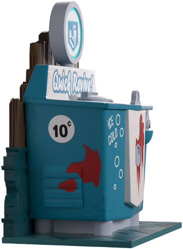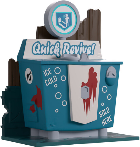 We’re here to bring you back from death’s door with the Quick Revive Youtooz! At 4.6 inches tall and sitting against a dilapidated wooden wall with a classy blue accent running along its bottom that’s covered in cracks and gouges, a round sign showing a man in front of a grave sits on top of the raised backing of its blue and white body.