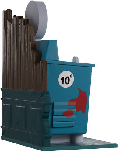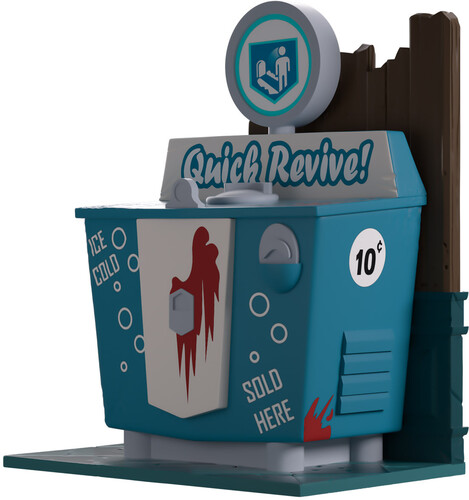 With bright red blood smeared over its front and sides, the words “Quick Revive!” are plastered on the back behind a round opening at the top as a coin slot sits on the front. The exterior of its packaging sees the machine in a fancy wooden room with a blue checkered floor, while the interior is pitch black and has a vibrant red blood spray across it. The protective sleeve is then covered in beaten-up wood panelling with red notches marked in it as the figure can be seen through the large clear window at the packaging’s front.