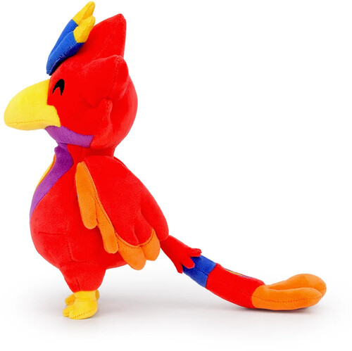 Standing at 9 inches tall on a pair of sharp golden talons, their red face fans out into 5 separate points as a long curved beak sits at its center and a bright blue and yellow plumage raises up from their forehead. With a stunning purple, orange and yellow pattern on their chest, their long colorful wings hug the sides of their body tightly as an elegant tail extends from their back and is beautifully patterned with blues, reds, yellows and oranges.