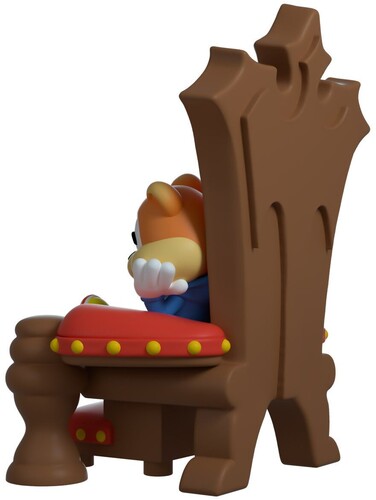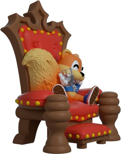 Conker’s figure sits at 4.8 inches tall, set on a luxurious red and oak brown throne. Conker sits in his blue lace up sneakers and a blue hoodie, holding a half-full glass. His bushy tail puffs out behind him and he grins, showing off his two front teeth.