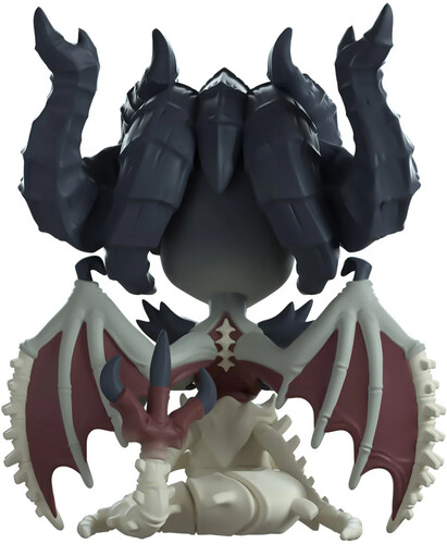 At 4.9 inches tall with her arms held out almost welcomingly, thick grey horns twist and spiral out from her head as white and blue eyes shine out from an intimidating face. With boney grey and maroon wings extending out from her back, her shoulders extend into dark points as a black diamond is inlaid in her chest and her thick segmented body wraps in on itself and ends in a tri-pointed, taloned tail.