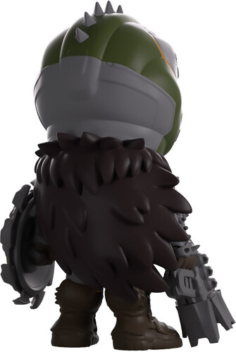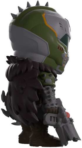Standing at 5.1 inches tall with a serrated green shield gripped in his left hand at the ready to tear a demon to shreds, while the right holds a grey gun that he’ll use to finish the job, they stare forward through a dirty green helmet that has spikes running along the top. With a feathered black cape flowing from his back and a chest plate covering his torso, chain links hang from under a brown waistcloth as sturdy boots cover his legs.