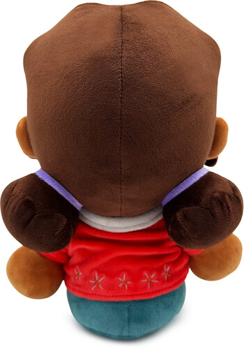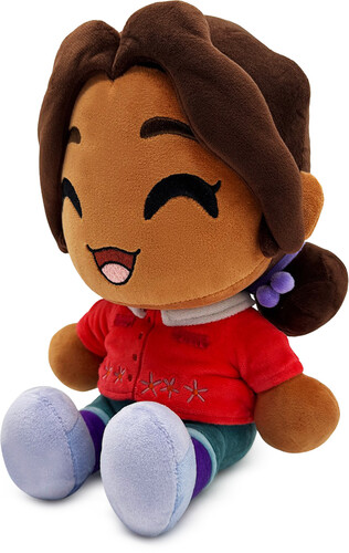 Sitting at 9 inches tall with a huge smile on her face as locks of wavy brown hair part in the middle and are pulled into two buns behind her head with purple pompom hair ties, her shirt collar pokes through the neck of a red sweater that has a flower pattern along the hem as she wears blue shorts and purple stockings that lead down to two tone sneakers.