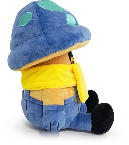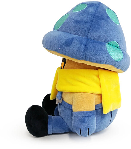 Sitting at 9 inches tall with a pair of bright orange pupils shining out from black eyeholes and a head that resembles a spotted blue mushroom cap, a yellow scarf that wraps around their tan face with the end falling over their chest.