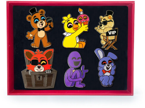 This collector's box comes with a variety of 6 different enamel pins. Each of the pins measure 1.5 inches in height with a shiny and high quality finish. The box comes with Freddy, Bonnie, Chica, Foxy, Purple Guy, and a Golden Freddy!