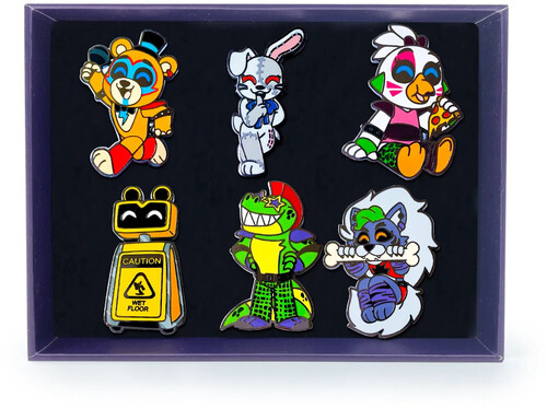 This Security Breach collector's box comes with a variety of 6 different enamel pins. Each of the pins measure 1.5 inches in height with a shiny and high quality finish. The box comes with Glamrock Freddy, Glamrock Chica, Montgomery Gator, Roxanne Wolf, Vanny, and the fan favorite, Wet Floor Sign!