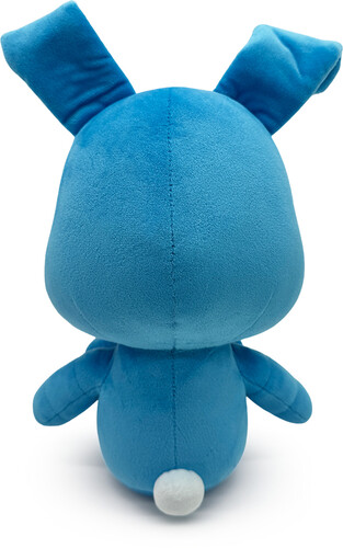 Sitting at 9 inches tall with huge green eyes absolutely beaming from under purple eyelids that have thick lashes curling out to the sides, bright red cheeks rest on either side of their light muzzle. With a pair of long blue ears curling forward and wearing a red bowtie around their neck, thin segmented lines run along his arms and legs as blocky feet kick forward.