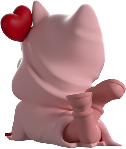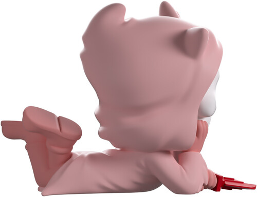 Swooning at 3.3 inches tall and laying on his stomach with legs kicking playfully as he's dressed in light pink robes, he props up his iconic mask with one hand while holding onto a red knife with the other as a red heart floats at the top of his head next to short pointed ears. The exterior of his packaging has been illustrated with blood trickling down a pink wall to form a perfect heart, while the interior and protective sleeve have been designed with bright pink scratches over a red background as his fi