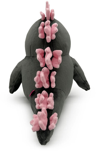 Sitting at 9 inches tall with a row of sharp teeth hanging over his light muzzle and furrowed eyebrows atop curved black eyes, his short arms rest at the sides of a thick torso. With a row of bright pink spikes leading from the back of his head down to the chunky tail that sticks out from his back, his short legs stick forward with clawed feet pointing upwards.