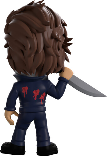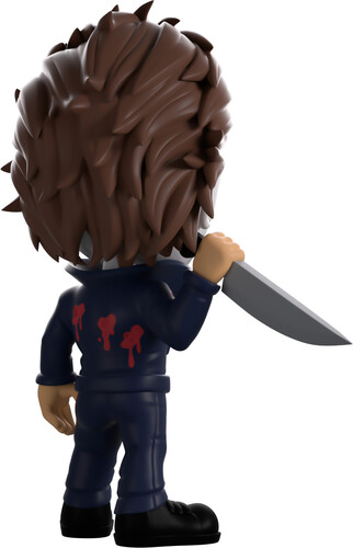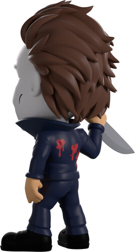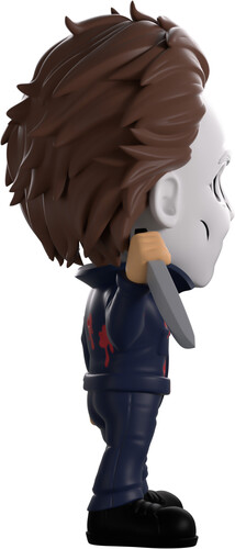 Nothing could stop Michael Myers from slashing his way into Youtooz! Like nothing… literally nothing… We can’t stop him! Standing at 4.9 inches tall and holding a long kitchen knife in a raised right hand, his iconic lifeless grey mask with gaunt eyes and pursed lips covers his head with messy brown hair swept back. Dressed in dark blue overalls that have a popped collar over a black shirt, bright red blood pours from the multiple futile gunshots marking his body as he wears solid black work boots.