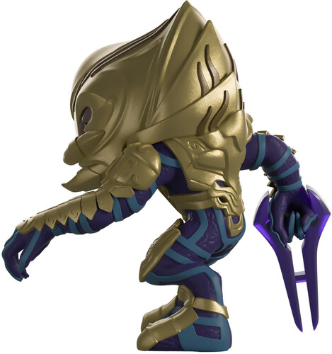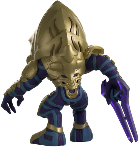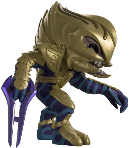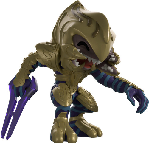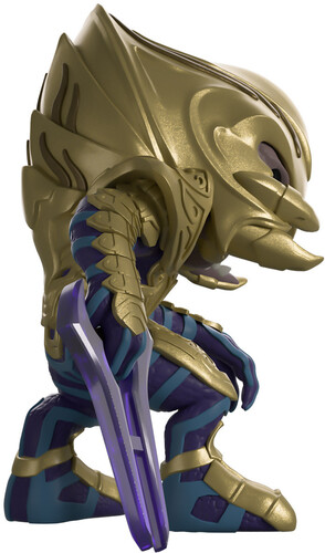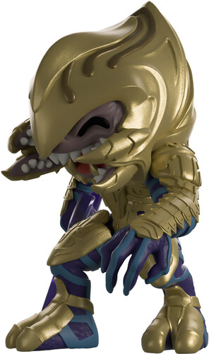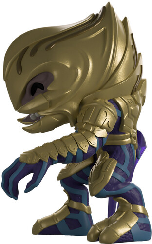 Taking a step forward at 4.1 inches tall and holding a pulsing energy sword in their right hand as they prepare to launch forward for a life-ending lunge, the mandibles of their grey face are lined with teeth and open up from an open snarling mouth. Wearing intricately patterned golden armour that curls over their head, torso, legs and arms, blue straps run along their scaled purple body which is protected underneath.
