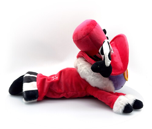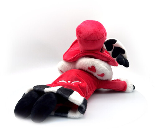 Laying at 16 inches long and weighing roughly 2 lbs/1kg, heart-shaped shades cover his deep red eyes as a playful smile crosses his purple face, and a tall red top hat with black stripes at the base and long heart-shaped feathers rests on his head.
