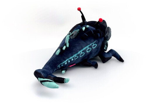 With jagged fins running down their dark blue back towards a hooked tail, pointed limbs run along either side of their grey stomach as long blue patterns mark their sides. This plush is packed to the seams with 100% PP cotton and is made of the softest minky material, absolutely perfect for cuddling or maybe swimming away from… REALLY FAST!