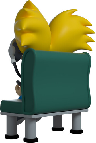 Sitting on a cushy green bus seat and jamming the sweetest tunes from the grey headset that sits over his oval head, grey wires lead down from his ears to the cassette player in his hand as the other taps away to the melody. With a smile curling up the side of his face and blue cap resting in between his iconic yellow hair, a green sweater sits over his long plaid shirt as tight blue pants lead down to large black shoes.