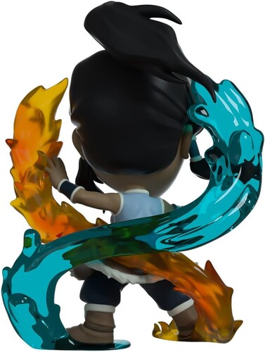 Korra stands at 4.9 inches, showcasing a determined smile on her face. Her ponytail and clothes sway through the wind as she is seen bending both water and fire. The fire stream goes up from her left side while the water stream goes up her right side. She is dressed in traditional Water Tribe colors and accessorized in colors of browns and blues.