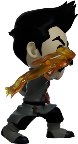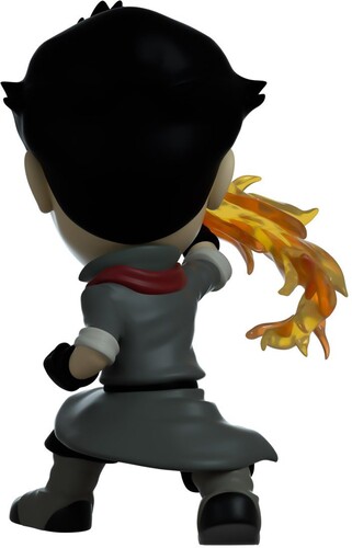 Mako stands at 4.8 inches, determined to do whatever it takes to win. He is dressed in gray and black clothing, with elements of red throughout to signify the Fire Nation. He is also wearing the red scarf that used to belong to his father. His left hand is in a fist and down below his hip. His right hand is in a mid punch motion with fire blazing out.