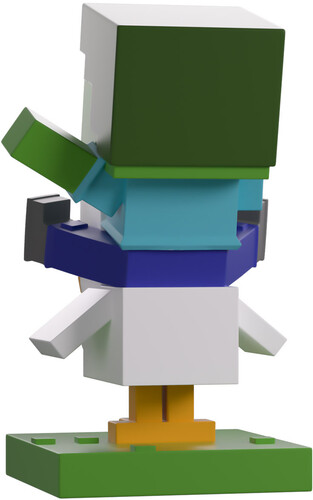 Here’s one fight you’re sure to lose! Sat atop a feisty chicken, this zombie is 4.5 inches tall and ready for a fight with their arms and legs outstretched as angled eyebrows rest on their blocky green face, as they wear a blue shirt and pants.