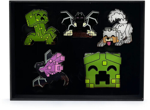 With 5 unique enamel pins that each measure in at 2 inches with a shiny, high quality finish, the collection contains a Wolf raising his tail and ready to pounce, a square Creeper head, a second Creeper struttin’ their stuff, the Ender Dragon unleashing a purple blast as they fly away and finally one of them sitting menacingly an staring forward with wings outstretched.